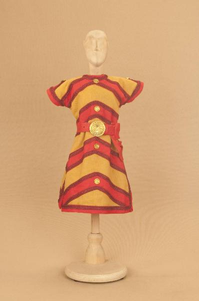 - NOTIZIE STORICO CRITICHE Il costume, che si completa con calzamaglia di cotone, con calze, cotta e cuffia in maglia di ferro e con elmo in metallo, è stato realizzato per il "Macbeth". Come altre opere di Shakespeare quali "Re Lear", "Otello", "Romeo e Giulietta", il "Macbeth" fu sempre presente nel repertorio delle Compagnie di marionette e burattini che, così, compivano la loro operazione di divulgazione in ambito popolare spostandosi di paesi in città.\nLa Carlo Colla e Figli, abbandonato il vecchio spettacolo entrato in repertorio come si rileva da un elenco delle produzioni di Carlo Colla nel Libro Mastro datato 1863-1879, ha messo in scena nel 2007 questo nuovo allestimento per lo Shakespeare Theater di Chicago, con la supervisione di Kate Bucley che ha curato la parte attorale in lingua ed i tagli al testo. Lo spettacolo, dopo la programmazione a Chicago, ha proseguito le repliche al New Victory Theater di Broadway e nel 2010 è apparso per la prima volta in Europa al Piccolo Teatro Grassi di Milano.