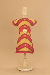 - NOTIZIE STORICO CRITICHE Il costume, che si completa con calzamaglia di cotone, con calze, cotta e cuffia in maglia di ferro e con elmo in metallo, è stato realizzato per il "Macbeth". Come altre opere di Shakespeare quali "Re Lear", "Otello", "Romeo e Giulietta", il "Macbeth" fu sempre presente nel repertorio delle Compagnie di marionette e burattini che, così, compivano la loro operazione di divulgazione in ambito popolare spostandosi di paesi in città.\nLa Carlo Colla e Figli, abbandonato il vecchio spettacolo entrato in repertorio come si rileva da un elenco delle produzioni di Carlo Colla nel Libro Mastro datato 1863-1879, ha messo in scena nel 2007 questo nuovo allestimento per lo Shakespeare Theater di Chicago, con la supervisione di Kate Bucley che ha curato la parte attorale in lingua ed i tagli al testo. Lo spettacolo, dopo la programmazione a Chicago, ha proseguito le repliche al New Victory Theater di Broadway e nel 2010 è apparso per la prima volta in Europa al Piccolo Teatro Grassi di Milano.