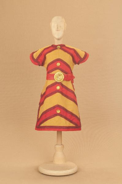 - NOTIZIE STORICO CRITICHE Il costume, che si completa con calzamaglia di cotone, con calze, cotta e cuffia in maglia di ferro e con elmo in metallo, è stato realizzato per il "Macbeth". Come altre opere di Shakespeare quali "Re Lear", "Otello", "Romeo e Giulietta", il "Macbeth" fu sempre presente nel repertorio delle Compagnie di marionette e burattini che, così, compivano la loro operazione di divulgazione in ambito popolare spostandosi di paesi in città.\nLa Carlo Colla e Figli, abbandonato il vecchio spettacolo entrato in repertorio come si rileva da un elenco delle produzioni di Carlo Colla nel Libro Mastro datato 1863-1879, ha messo in scena nel 2007 questo nuovo allestimento per lo Shakespeare Theater di Chicago, con la supervisione di Kate Bucley che ha curato la parte attorale in lingua ed i tagli al testo. Lo spettacolo, dopo la programmazione a Chicago, ha proseguito le repliche al New Victory Theater di Broadway e nel 2010 è apparso per la prima volta in Europa al Piccolo Teatro Grassi di Milano.