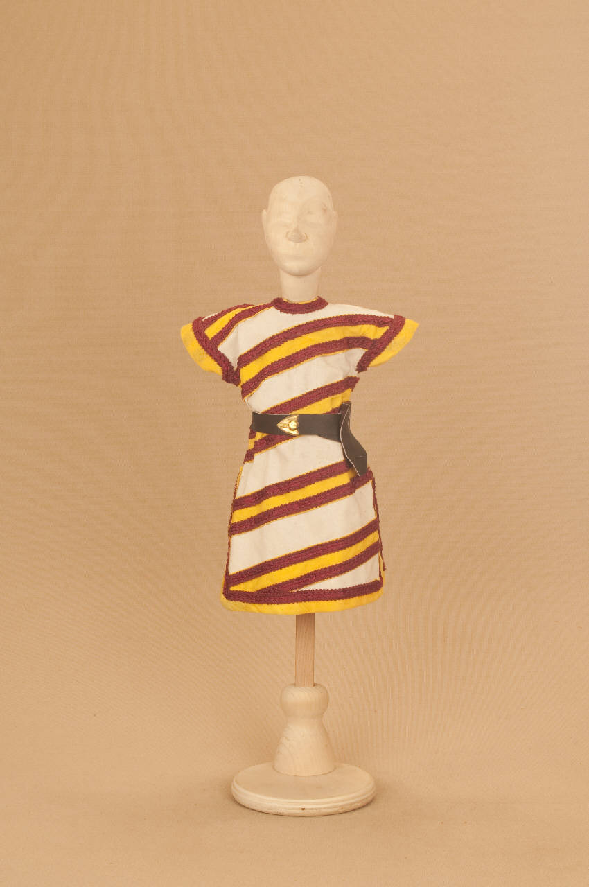 - NOTIZIE STORICO CRITICHE Il costume, che si completa con calzamaglia di cotone, con calze e cotta in maglia di ferro e con cuffia in pelle, è stato realizzato per il "Macbeth". Come altre opere di Shakespeare quali "Re Lear", "Otello", "Romeo e Giulietta", il "Macbeth" fu sempre presente nel repertorio delle Compagnie di marionette e burattini che, così, compivano la loro operazione di divulgazione in ambito popolare spostandosi di paesi in città.\nLa Carlo Colla e Figli, abbandonato il vecchio spettacolo entrato in repertorio come si rileva da un elenco delle produzioni di Carlo Colla nel Libro Mastro datato 1863-1879, ha messo in scena nel 2007 questo nuovo allestimento per lo Shakespeare Theater di Chicago, con la supervisione di Kate Bucley che ha curato la parte attorale in lingua ed i tagli al testo. Lo spettacolo, dopo la programmazione a Chicago, ha proseguito le repliche al New Victory Theater di Broadway e nel 2010 è apparso per la prima volta in Europa al Piccolo Teatro Grassi di Milano.
