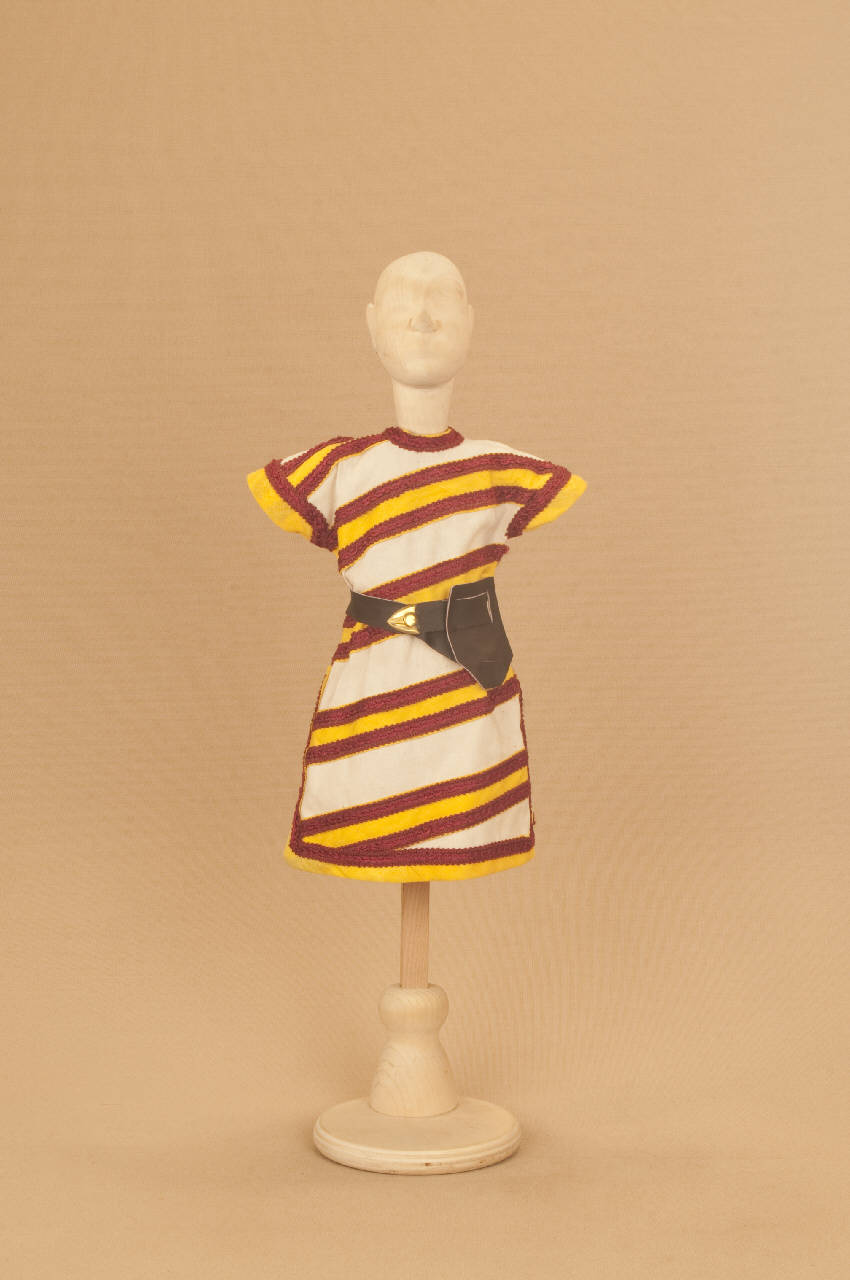 - NOTIZIE STORICO CRITICHE Il costume, che si completa con calzamaglia di cotone, con calze e cotta in maglia di ferro e con cuffia in pelle, è stato realizzato per il "Macbeth". Come altre opere di Shakespeare quali "Re Lear", "Otello", "Romeo e Giulietta", il "Macbeth" fu sempre presente nel repertorio delle Compagnie di marionette e burattini che, così, compivano la loro operazione di divulgazione in ambito popolare spostandosi di paesi in città.\nLa Carlo Colla e Figli, abbandonato il vecchio spettacolo entrato in repertorio come si rileva da un elenco delle produzioni di Carlo Colla nel Libro Mastro datato 1863-1879, ha messo in scena nel 2007 questo nuovo allestimento per lo Shakespeare Theater di Chicago, con la supervisione di Kate Bucley che ha curato la parte attorale in lingua ed i tagli al testo. Lo spettacolo, dopo la programmazione a Chicago, ha proseguito le repliche al New Victory Theater di Broadway e nel 2010 è apparso per la prima volta in Europa al Piccolo Teatro Grassi di Milano.
