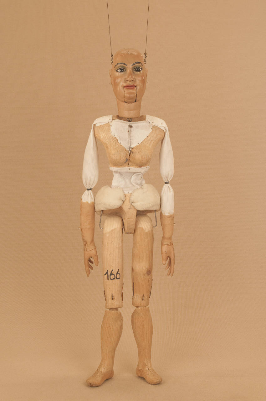 Testa in legno di tiglio fissata al corpo tramite ferro; occhi di vetro; bocca mobile con contrappeso; corpo in abete tagliato con 4 anelli. Gambe attaccate con ferro al bacino; ginocchia ad incastro; mani mobili in tiglio con dita scolpite e separate. Piedi piombati. Bilancino a croce per coppie.