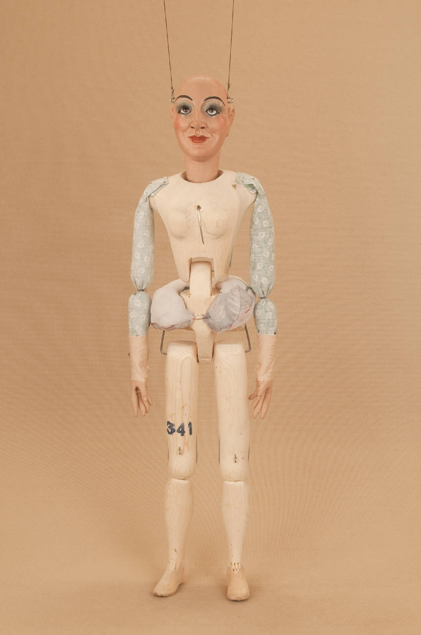 Testa di legno di tiglio fissata al corpo tramite ferro, occhi di vetro, bocca fissa. Corpo normale in abete snodato in vita ad incastro. Gambe unite al bacino tramite bordione in ferro, ginocchia ad incastro. Mani mobili in tiglio con dita scolpite e separate. Piedi piombati. Bilancino a croce metodo Holden.