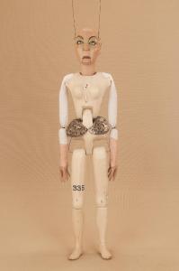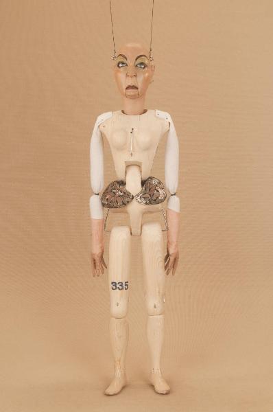Testa di legno di tiglio fissata al corpo tramite ferro, occhi di vetro, bocca mobile. Corpo normale in abete snodato in vita ad incastro. Gambe unite al bacino tramite bordione in ferro, ginocchia ad incastro. Mani mobili in tiglio con dita scolpite e separate. Piedi piombati. Bilancino a croce metodo Holden.