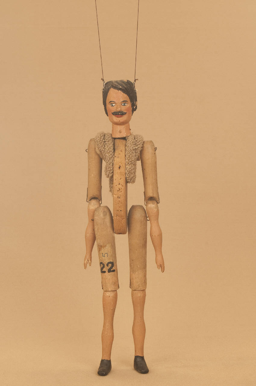 Testa in tiglio bloccata sul corpo in abete con arti in pioppo. Distanziatore in sughero per le braccia. Articolazioni realizzate con passanti in ferro.