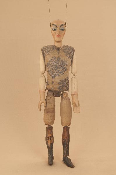 Testa di cartapesta fissata al corpo tramite ferro. Occhi di vetro. Bocca fissa. Corpo, dai volumi approssimativi, in pioppo con gambe attaccate con ferro al bacino, ginocchia ad incastro. Mani in tiglio a spatola con dita segnate. Gambe imbottite e piedi dipinti di nero. Bilancino originale metodo Holden. La testa presenta un anello, ripiegato, per il movimento con il bilancino a pugnetto.