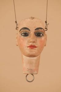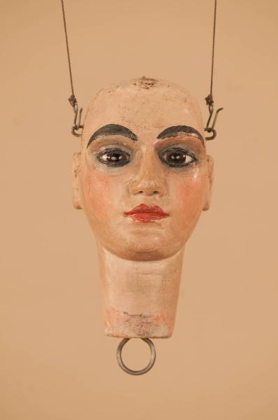 Testa in legno di tiglio con anello in ferro per bloccaggio al corpo. Occhi di vetro. Dipintura con colori ad olio.