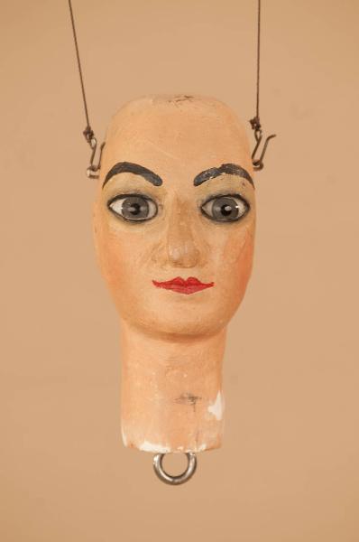 Testa in legno di tiglio con anello in ferro per bloccaggio al corpo. Occhi di vetro. Dipintura con colori ad olio.