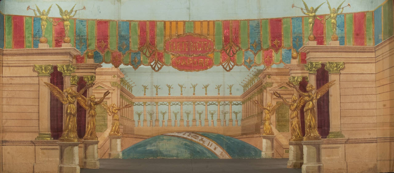 - NOTIZIE STORICO CRITICHE Scenografia realizzata per Il ballo "Excelsior", spettacolo che fu rappresentato la prima volta a Milano, al Teatro alla Scala, la sera dell'11 gennaio 1881. Autore del libretto e della coreografia era Luigi Manzotti, mentre Romualdo Marengo lo era della musica e Alfredo Edel delle scene e dei costumi. Il successo del ballo fu travolgente. Le repliche furono 103 nella stagione. La versione marionettistica per la Compagnia Carlo Colla e Figli in due tempi e undici quadri fu allestita da Carlo II Colla col consenso dell'autore e presentata col titolo di "Civiltà e Progresso" nel 1895. Il titolo mutò poi nel tempo. Il primo allestimento del ballo ricordava ancora troppo l'originale scaligero. Ma fu sufficiente che lo spettacolo entrasse nella routine degli spostamenti della Compagnia perché le peculiarità del teatro marionettistico diventassero preponderanti.Così l'"Excelsior" approdò al Teatro Gerolamo di Milano, quando la Compagnia ci entrò stabilmente nel 1906, proprio negli anni in cui, dopo qualche ultima apparizione, il "ballo grande" italiano, simbolico-narrativo sta tramontando sulle scene europee, divenendo unico retaggio del teatro delle marionette e, più particolarmente, della Compagnia Carlo Colla e Figli che ha continuato a riproporlo sino ad oggi, offrendo al pubblico di un secolo dopo la più vivida testimonianza del kolossal scaligero. Da nota scritta a matita sul "Giro Piazze della Compagnia Carlo Colla e Figli 1883-1912" si evince che la prima rappresentazione del ballo "Excelsior" è stata fatta a Caluso (TO) nel 1895.
