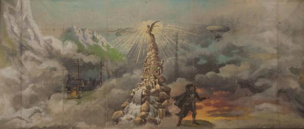 - NOTIZIE STORICO CRITICHE Sipario realizzato per Il ballo "Excelsior", spettacolo che fu rappresentato la prima volta a Milano, al Teatro alla Scala, la sera dell'11 gennaio 1881. Autore del libretto e della coreografia era Luigi Manzotti, mentre Romualdo Marengo lo era della musica e Alfredo Edel delle scene e dei costumi.\nIl successo del ballo fu travolgente. Le repliche furono 103 nella stagione.\nLa versione marionettistica per la Compagnia Carlo Colla e Figli in due tempi e undici quadri fu allestita da Carlo II Colla col consenso dell'autore e presentata col titolo di "Civiltà e Progresso" nel 1895. Il titolo mutò poi nel tempo. Il primo allestimento del ballo ricordava ancora troppo l'originale scaligero. Ma fu sufficiente che lo spettacolo entrasse nella routine degli spostamenti della Compagnia perché le peculiarità del teatro marionettistico diventassero preponderanti.\nCosì l'"Excelsior" approdò al Teatro Gerolamo di Milano, quando la Compagnia ci entrò stabilmente nel 1906, proprio negli anni in cui, dopo qualche ultima apparizione, il "ballo grande" italiano, simbolico-narrativo sta tramontando sulle scene europee, divenendo unico retaggio del teatro delle marionette e, più particolarmente, della Compagnia Carlo Colla e Figli che ha continuato a riproporlo sino ad oggi, offrendo al pubblico di un secolo dopo la più vivida testimonianza del kolossal scaligero. Da nota scritta a matita sul "Giro Piazze della Compagnia Carlo Colla e Figli 1883-1912" si evince che la prima rappresentazione del ballo "Excelsior" è stata fatta a Caluso (TO) nel 1895.