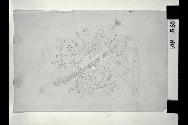 Trofeo con strumenti musicali e rami di alloro e quercia. Trofeo con strumenti musicali e rami di alloro e quercia