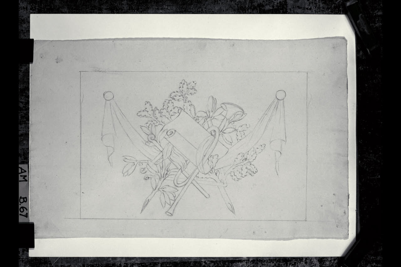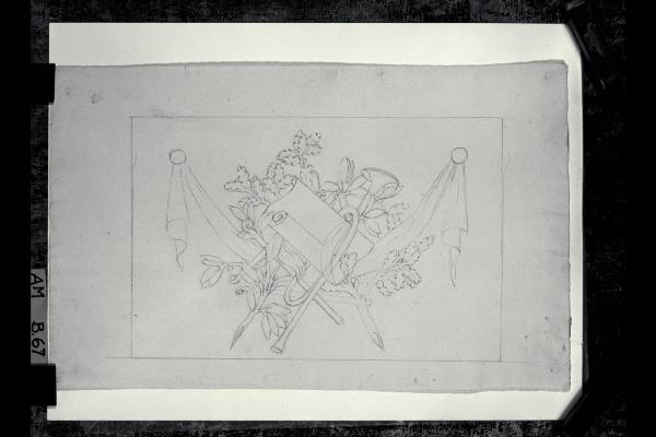 Trofeo con strumenti musicali e rami di alloro e quercia. Trofeo con strumenti musicali e rami di alloro e quercia