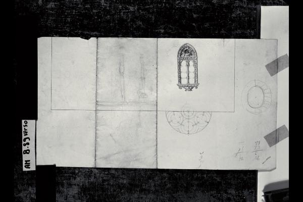Prospetto di bifora neogotica e dettagli decorativi. Prospetto di bifora neogotica e dettagli decorativi