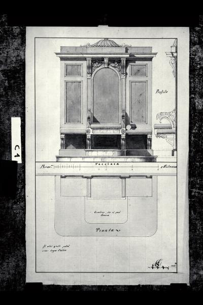 Pianta, sezione e prospetto del seggio per un arciprete. Pianta, sezione e prospetto del seggio per un arciprete