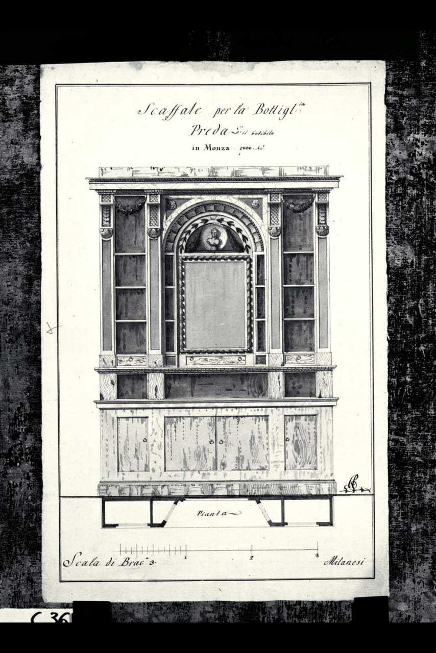 Pianta e prospetto di uno scaffale della bottiglieria Preda a Monza. Pianta e prospetto di uno scaffale della bottiglieria Preda a Monza