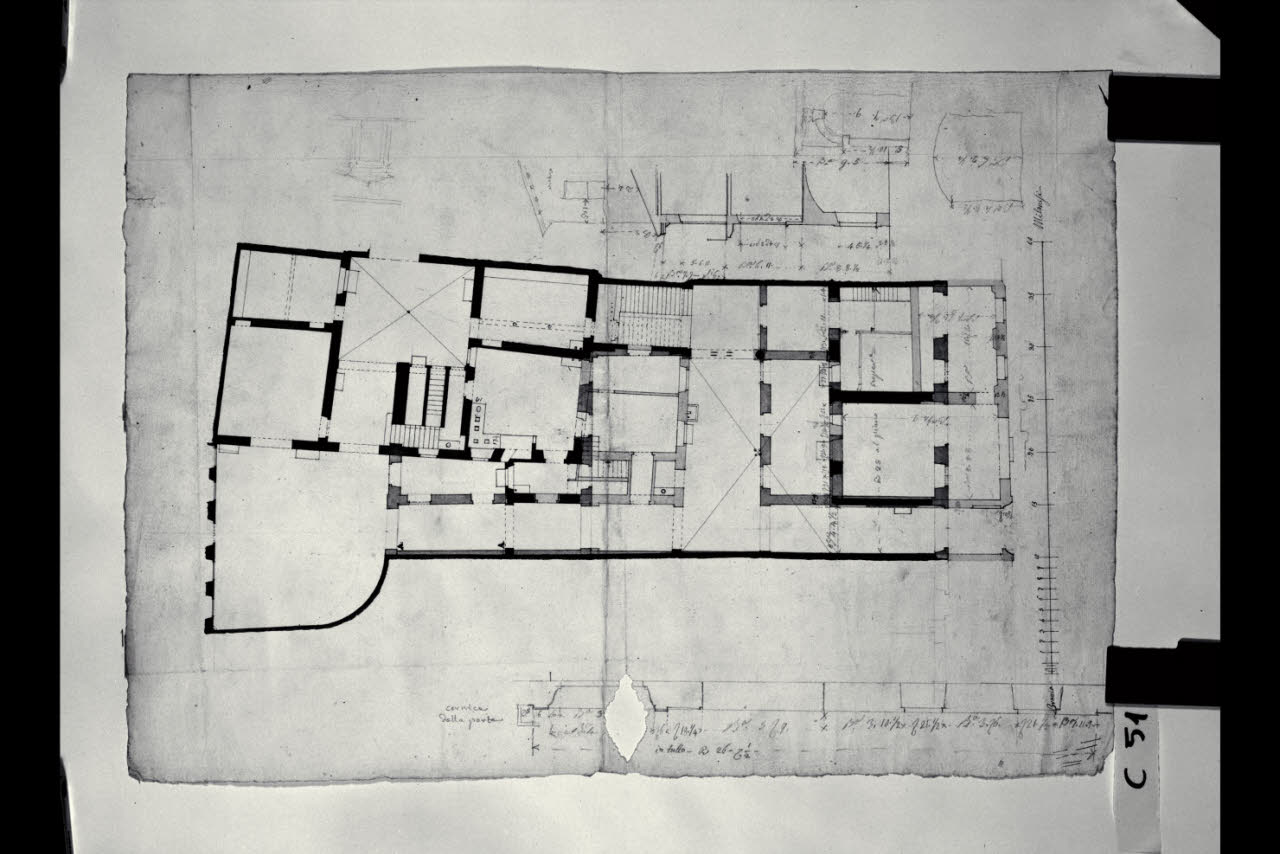 Pianta e sezione parziale della Casa Brocca a Milano (già Corsia de' Servi 603). Pianta e sezione parziale della Casa Brocca a Milano (già Corsia de' Servi 603)