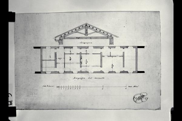 Pianta di un mezzano della Villa Durini (detta Grassa) a Monza con sezione del tetto. Pianta di un mezzano della Villa Durini (detta Grassa) a Monza con sezione del tetto