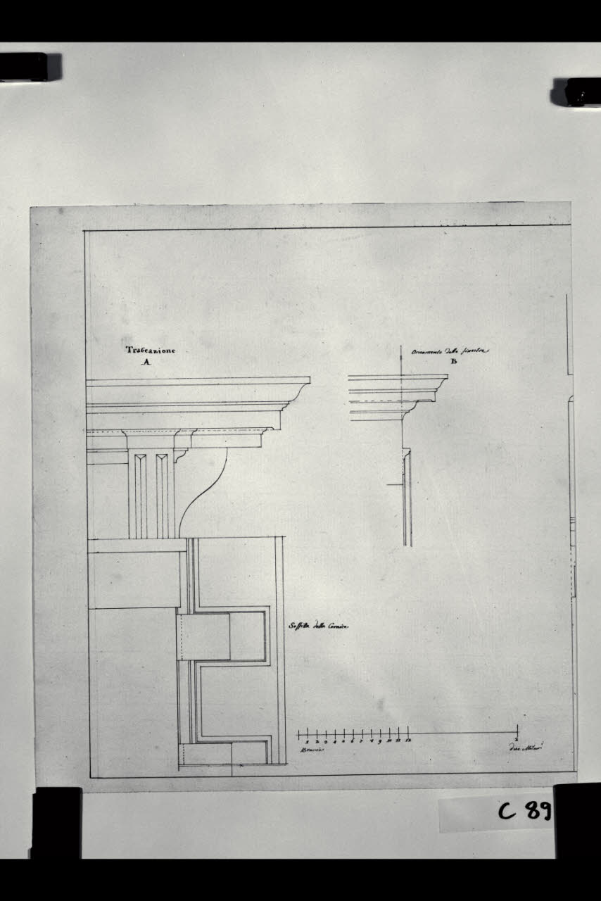 Proiezione in pianta, prospetto e sezione dell'ornamento di una finestra. Proiezione in pianta, prospetto e sezione dell'ornamento di una finestra
