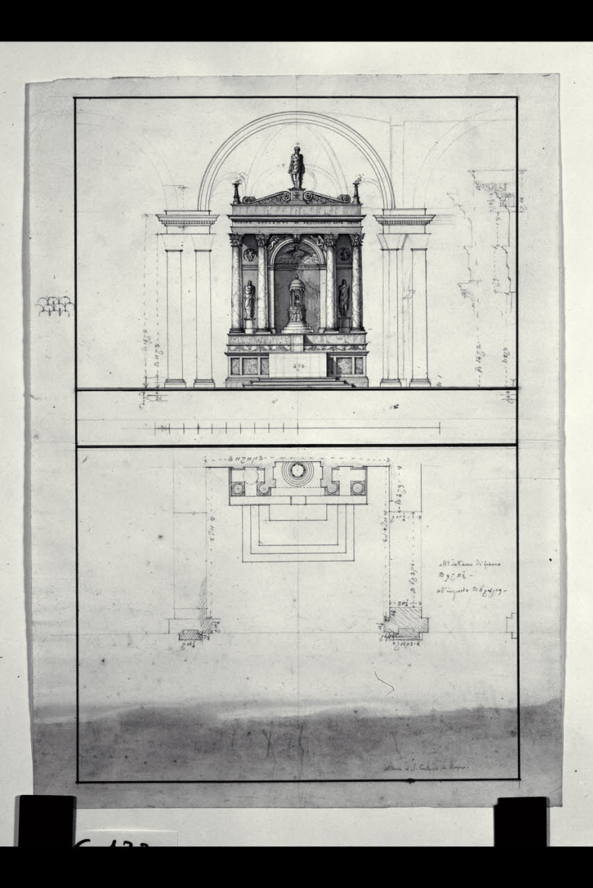 Pianta, prospetto e sezione dell'altare di S. Contardo nella chiesa arcipretale a Broni. Pianta, prospetto e sezione dell'altare di S. Contardo nella chiesa arcipretale a Broni