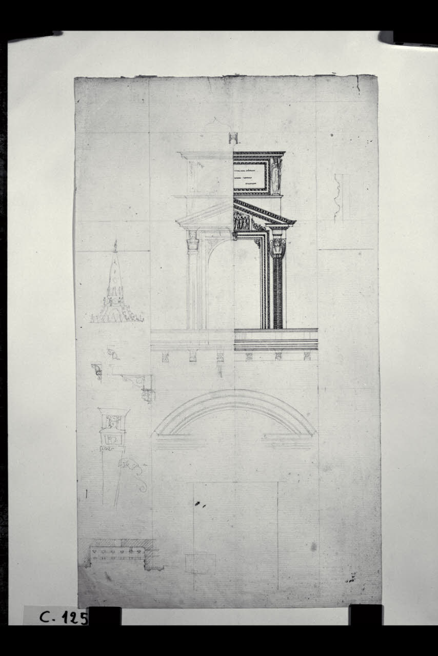 Prospetto del balcone delle omelie del Duomo di Milano e dettagli di elementi decorativi. Prospetto del balcone delle omelie del Duomo di Milano e dettagli di elementi decorativi