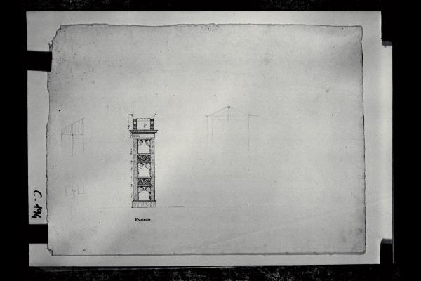 disegno quotato eseguito a china, acquerelli colorati e grafite su carta bianca