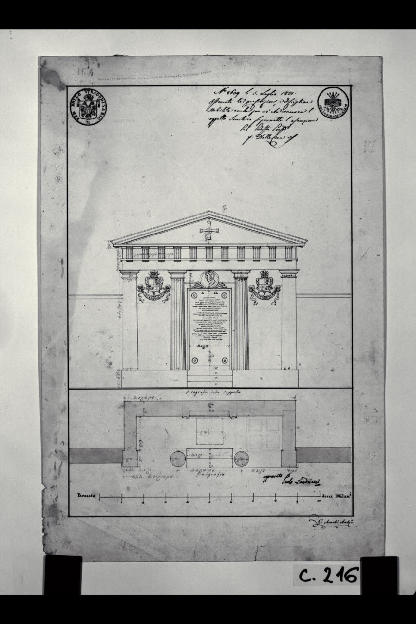 Pianta e prospetto dell'edicola funeraria per il barone Augusto Bataille già nel cimitero di Porta Romana a Milano. Pianta e prospetto dell'edicola funeraria per il barone Augusto Bataille già nel cimitero di Porta Romana a Milano