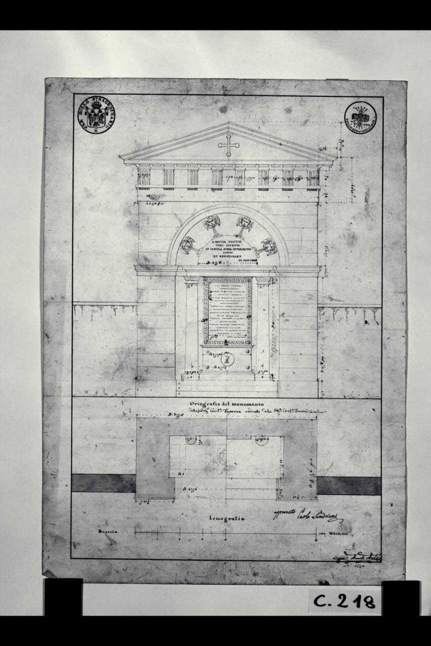 Pianta e prospetto dell'edicola funeraria della contessa Paola Taverna già nel cimitero di Porta Romana a Milano. Pianta e prospetto dell'edicola funeraria della contessa Paola Taverna già nel cimitero di Porta Romana a Milano