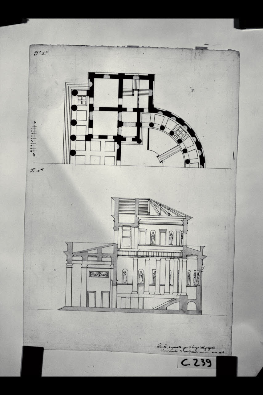 Pianta e sezione di una scuola di anatomia. Pianta e sezione di una scuola di anatomia