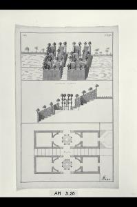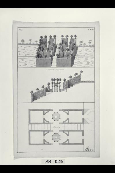 Pianta, sezione e prospetto in assonometria di una carpanata in pendio. Pianta, sezione e prospetto in assonometria di una carpanata in pendio
