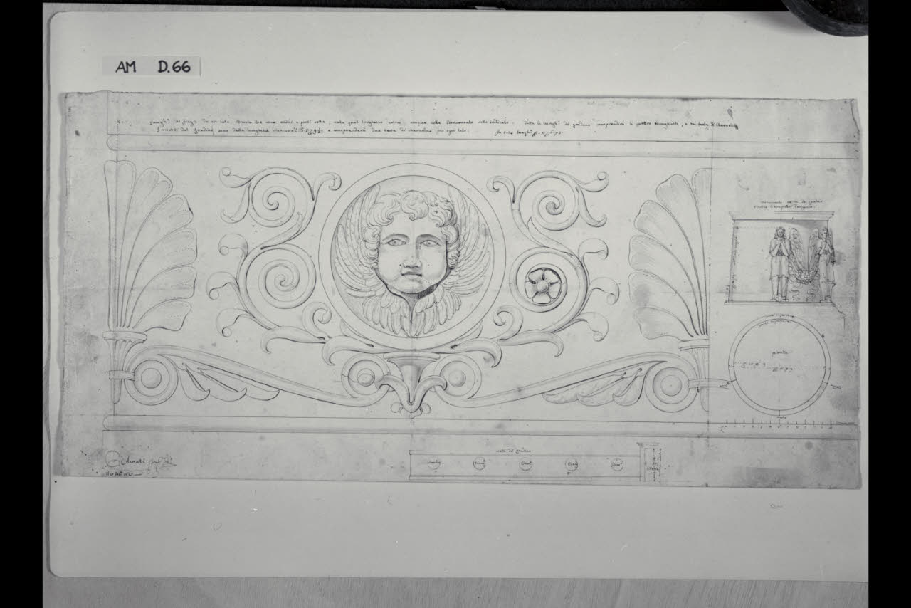 Fregio per altare con testa di cherubino tra palmette e pianta e prospetto del piedistallo a rilievi di un ciborio. Fregio per altare con testa di cherubino tra palmette e pianta e prospetto del piedistallo a rilievi di un ciborio