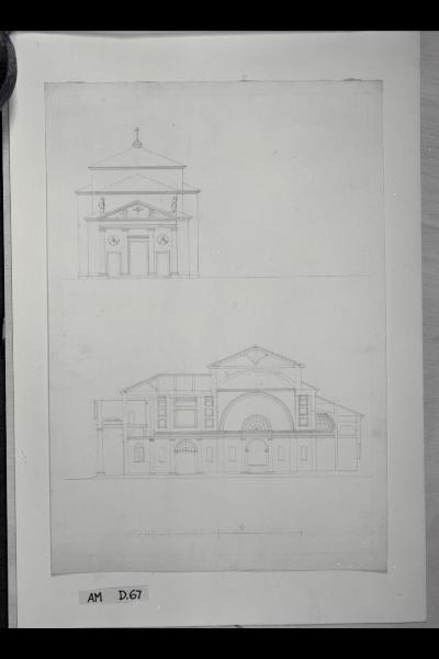 Prospetto e sezione longitudinale della chiesa di S. Bartolomeo a Brugherio. Prospetto e sezione longitudinale della chiesa di S. Bartolomeo a Brugherio