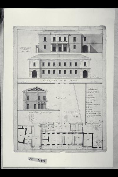 Pianta, sezione trasversale, prospetti verso il cortile e verso la strada della Villa Sormani a Cornate d'Adda. Pianta, sezione trasversale, prospetti verso il cortile e verso la strada della Villa Sormani a Cornate d'Adda