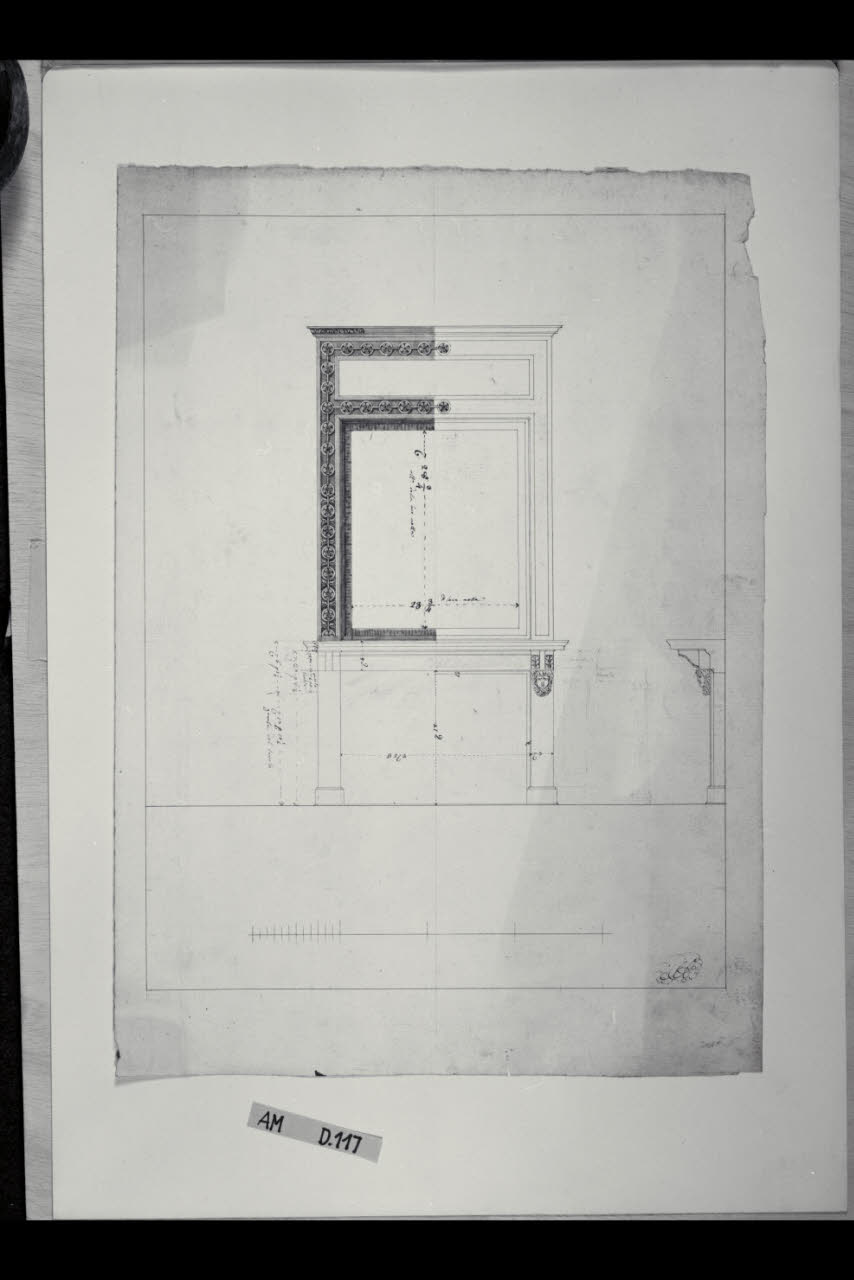 Prospetto e sezione trasversale di camino della Casa Perego e prospetto di cornice. Prospetto e sezione trasversale di camino della Casa Perego e prospetto di cornice