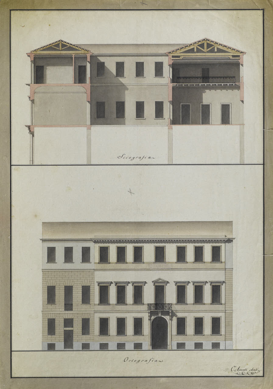 Sezione trasversale e prospetto di Palazzo Arrigoni a Milano (già Contrada S. Romano 403). Sezione trasversale e prospetto di Palazzo Arrigoni a Milano (già Contrada S. Romano 403)
