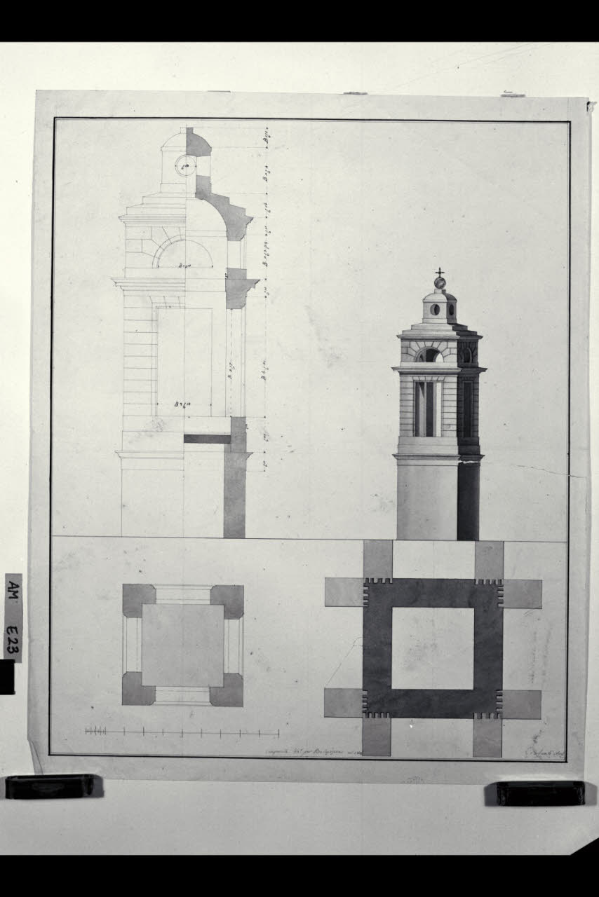 Pianta, prospetto sezionato e prospetto in assonometria del campanile della chiesa di S. Michele Arcangelo a Belgioioso. Pianta, prospetto sezionato e prospetto in assonometria del campanile della chiesa di S. Michele Arcangelo a Belgioioso