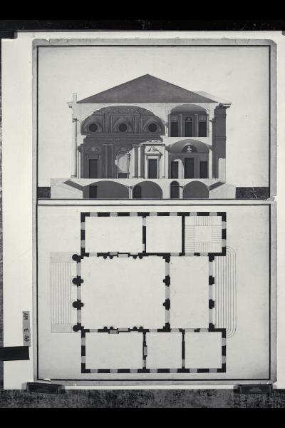Pianta e sezione longitudinale di villa con salone monumentale. Pianta e sezione longitudinale di villa con salone monumentale
