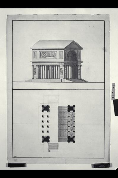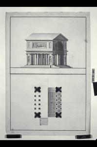 Pianta, prospetto frontale e laterale in assonometria di monumento commemorativo a forma di tempietto con proiezione in pianta dei lacunari. Pianta, prospetto frontale e laterale in assonometria di monumento commemorativo a forma di tempietto con proiezione in pianta dei lacunari