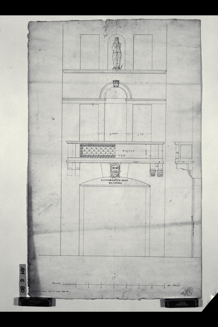Prospetto della facciata della Drogheria di Giovanni Battista Amati a Milano (già Contrada del Carrobbio 3455-3456). Prospetto della facciata della Drogheria di Giovanni Battista Amati a Milano (già Contrada del Carrobbio 3455-3456)