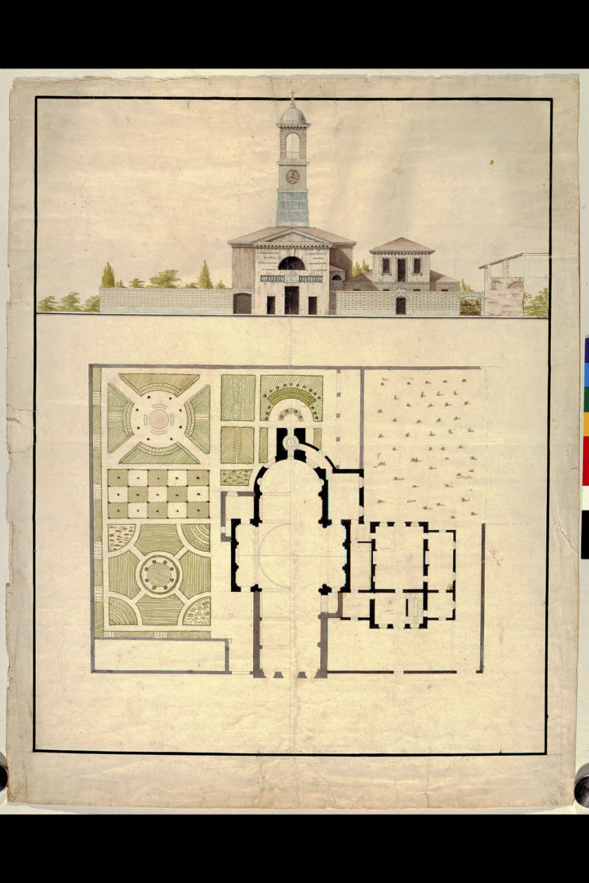 Pianta e prospetto di chiesa e casa parrocchiale. Pianta e prospetto di chiesa e casa parrocchiale