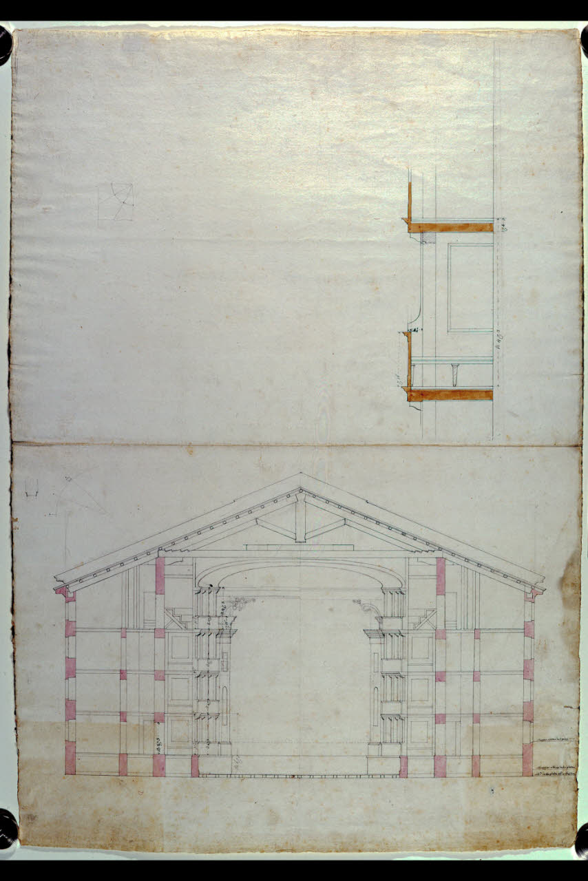 Sezione trasversale e particolare della sezione di un palchetto del Teatro di Monza. Sezione trasversale e particolare della sezione di un palchetto del Teatro di Monza
