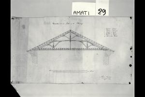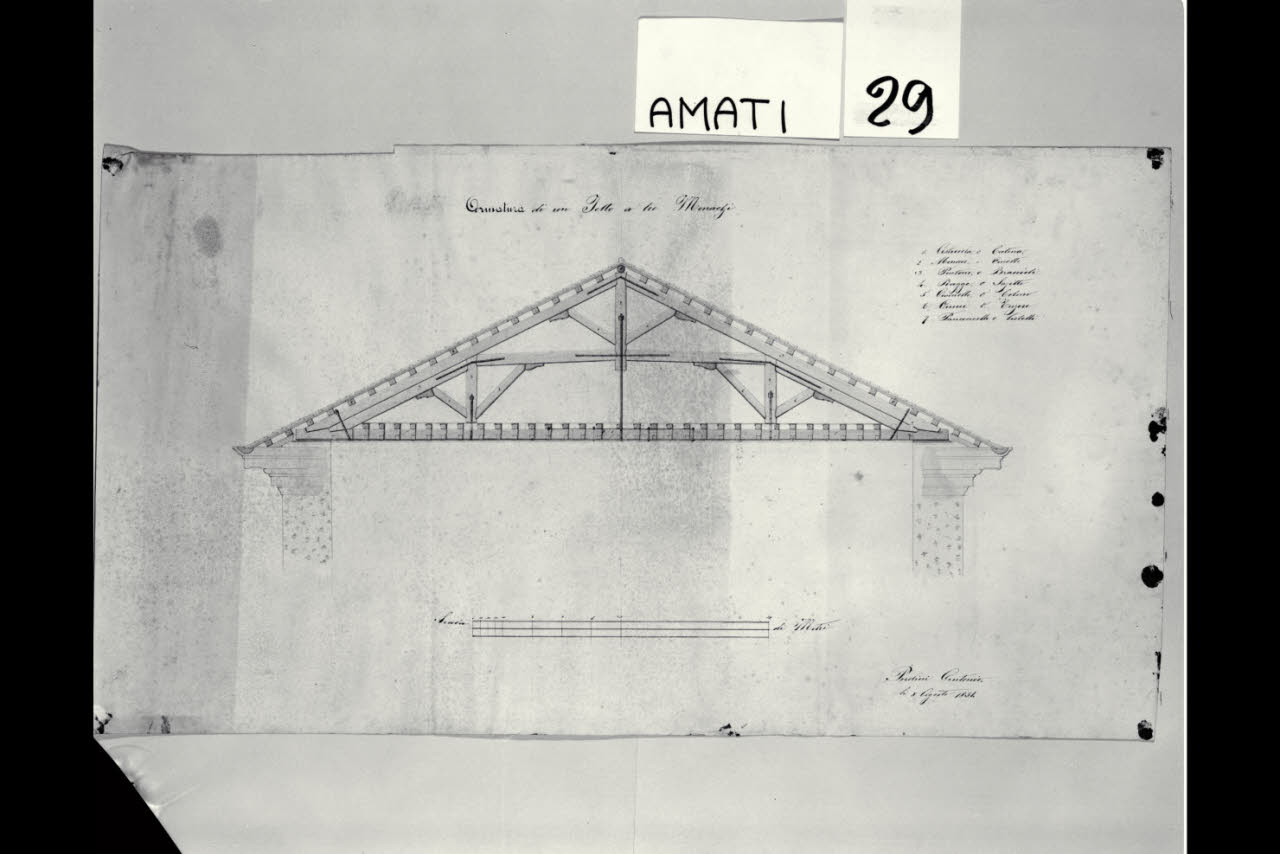 Prospetto dell'orditura di un tetto a tre monachi. Prospetto dell'orditura di un tetto a tre monachi