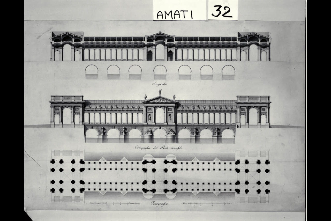 Pianta, prospetto e sezione trasversale di un ponte trionfale. Pianta, prospetto e sezione trasversale di un ponte trionfale