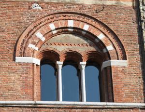 Trifora leggermente strombata costutita da ghiera modanata, lunetta con decoro plastico - pittorico e colonne binate.