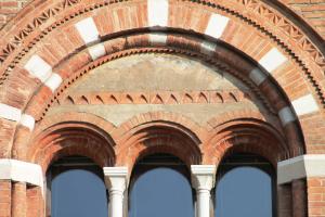 cornice costituita da una teoria di architetti a sesto acuto sormontato da una decorazione pittorica illeggibile.