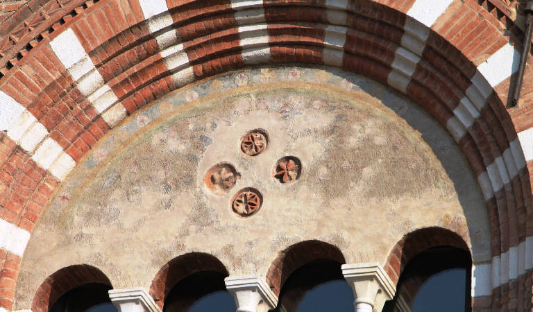 Decorazione a rilievo costutita da quattro piccoli rosoni in cotto decorati a rilievo con motivi floreali stilizzati e circondati da una decorazione pittorica.