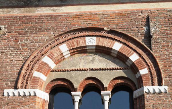 La ghiera costituisce il coronamento superiore della trifora e si sviluppa attraverso un arco a pieno centro leggermente strombato definito, lungo il profilo superiore, da una sottile cornice rilevata alla quale sseguono tre fasce decorative concentriche. La prima presenta un motivo decorativo vegetale stilizzato, la seconda un motivo geometrico a rilievo, la terza si caratterizza per una alternanza di conci in marmo bianco e mattoni. La chiave d'arco è decorata a rilievo con un motivo floreale.\nLa ghiera è raccordata agli stipiti della finestra attraverso due elementi architettonici in marmo bianco sagomati e modanati in corrispondenza della strombatura e decorati con un fregio ad archetti sulla fronte esterna.