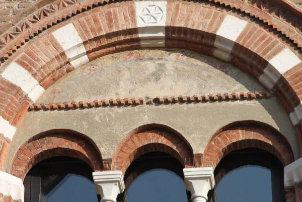 Cornice a dentelli rilevati sormontato da una decorazione pittorica.