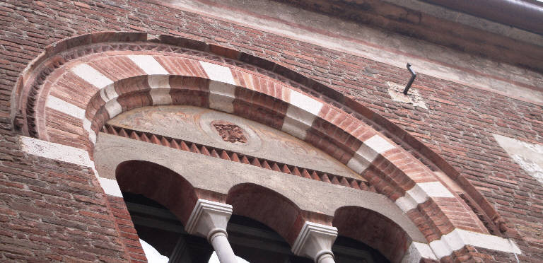 La ghiera costituisce il coronamento superiore della trifora e si sviluppa attraverso un arco a pieno centro leggermente strombato definito, lungo il profilo superiore, da una sottile cornice rilevata alla quale sseguono due fasce decorative concentriche. La prima presenta un motivo decorativo geometrico a rilievo, la seconda si caratterizza per una alternanza di conci in marmo bianco e mattoni. \nLa ghiera è raccordata agli stipiti della finestra attraverso due elementi architettonici in marmo bianco sagomati e modanati in corrispondenza della strombatura.