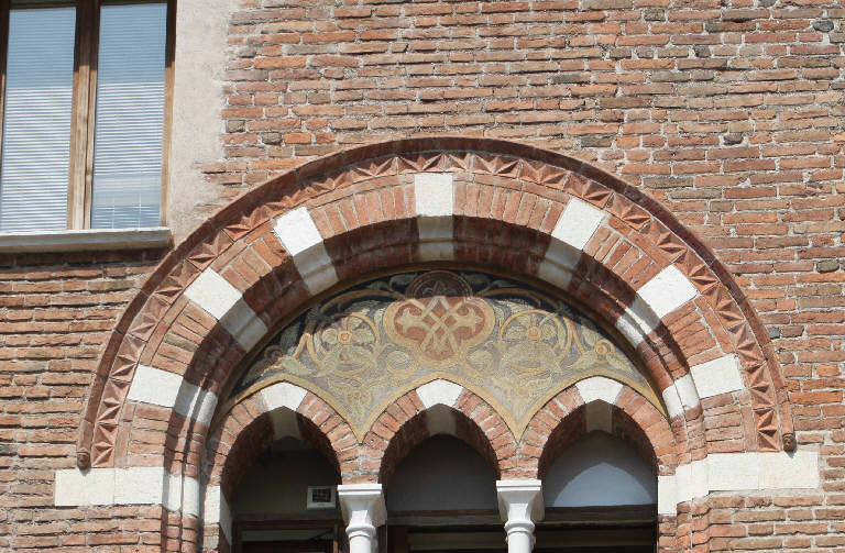 La ghiera costituisce il coronamento superiore della trifora e si sviluppa attraverso un arco a pieno centro leggermente strombato definito, lungo il profilo superiore, da una sottile cornice rilevata che si conclude con due testine antropomorfe a rilievo. Ad essa seguono due fasce decorative concentriche, la prima delle quali presenta un motivo decorativo geometrico a rilievo mentre la seconda si caratterizza per una alternanza di conci in marmo bianco e mattoni. \nLa ghiera è raccordata agli stipiti della finestra attraverso due elementi architettonici in marmo bianco sagomati e modanati in corrispondenza della strombatura.