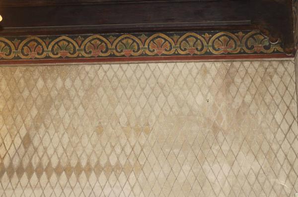 Decorazione pittorica che si estende sull'intera superficie delle pareti perimetrali della sala.